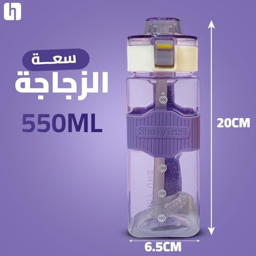 زجاجة مياه بمقبض سعة 550 مل خالية من مادة البيسفينول أ BPA ومانعة للتسرب وقابلة لإعادة الاستخدام مع محدد وقت الشرب وشفاطة، زجاجة مياه مثالية للجيم والسفر والمنزل، بلون أرجواني