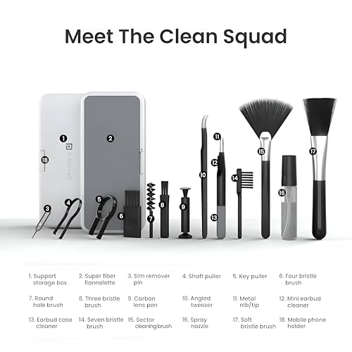 - تقدم مجموعة أدوات التنظيف 18 في 1 حلا شاملا للحفاظ على أجهزتك في حالة نظيفة. سواء كان هاتفك المحمول أو الكمبيوتر المحمول أو سماعات الرأس أو الشاشات ، فإن هذه المجموعة تضمن أن جميع أدواتك تبدو جيدة مثل الجديدة من خلال معالجة الأوساخ والأوساخ بسهولة.