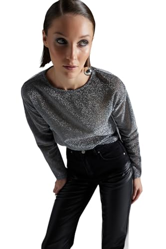 بلوزة محبوكة من التول الشفاف بقبة دائرية ضيقة وقصة عادية للنساء طراز TWOAW24BZ00019 من ترنديول، لون أسود