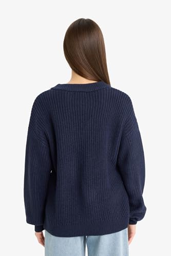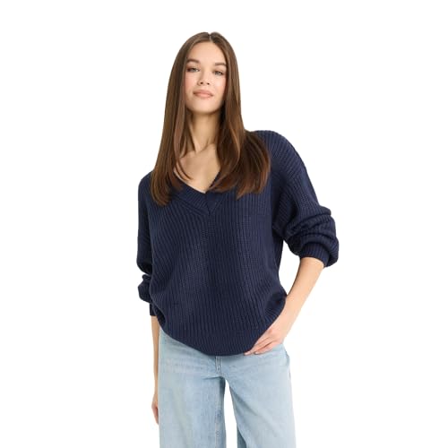 بلوفر تريكو للنساء بمقاس كبير وقبة V وأكمام طويلة من ديفاكتو، كحلي، Z7135AZ