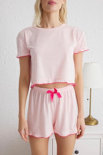 ترنديول طقم بيجامة محبوك بكشكشة وشريط وفيونكة للنساء، لون بينك، THMSS25PT00153