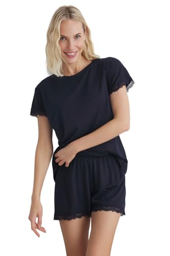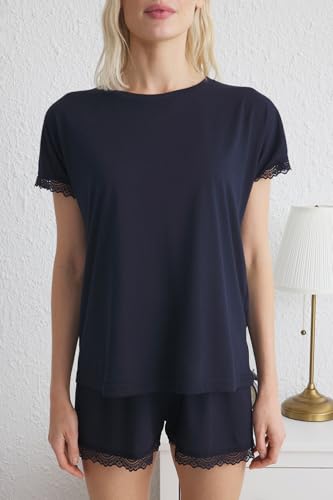 ترنديول طقم بيجامة محبوكة من قماش جورسيه من الدانتيل بلون كحلي للنساء، موديل THMSS25PT00149