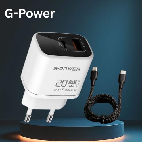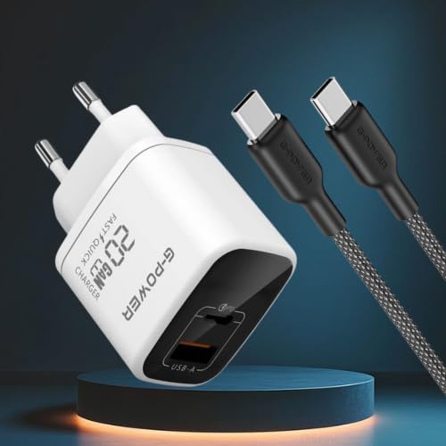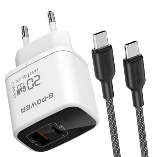 شاحن سريع مزدوج USB 20 واط + كيبل USB-C الى USB-C من جي باور، شحن سريع 3.0، لسلسلة ايفون 17/16/15، سامسونج، شاومي، بيكسل، ايباد، ابيض/اسود