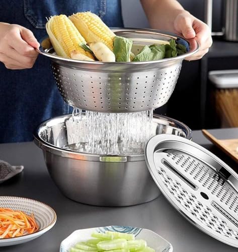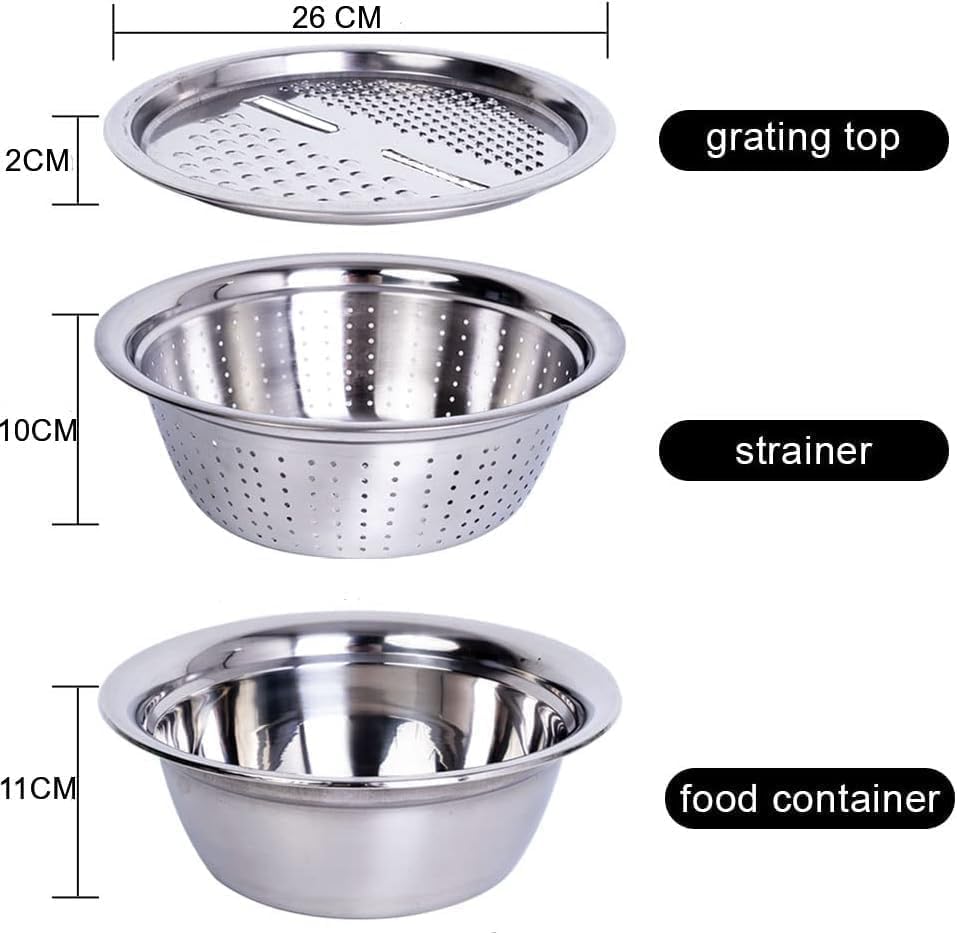 أداة مطبخ متعددة الوظائف 3 في 1، عجّانة، مبشرة، وصفاية من الفولاذ المقاوم للصدأ، فضي
