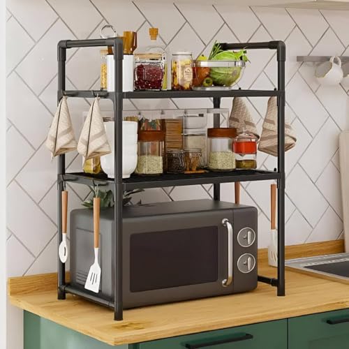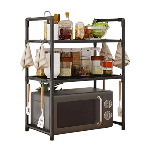 منظم مطبخ معدني 2 دور بتصميم عملي من Next store – رفوف تخزين قوية للميكروويف والأجهزة الصغيرة – مزود بخطافات جانبية لتعليق الأدوات والبهارات والبرطمانات (اسود)