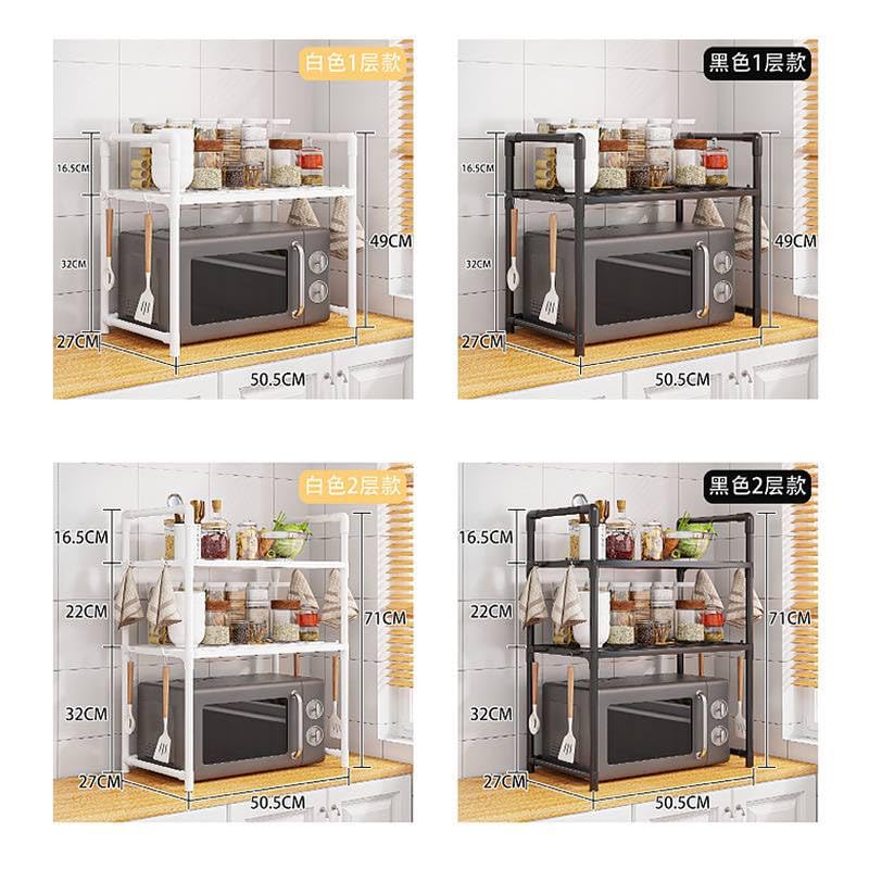 - [تصميم عملي ذو طابقين:] منظم مطبخ معدني يوفر رفّين متينين لترتيب البرطمانات، البهارات أو الأدوات، مع إمكانية وضع الميكروويف أو الأجهزة الصغيرة بكل أمان وثبات.