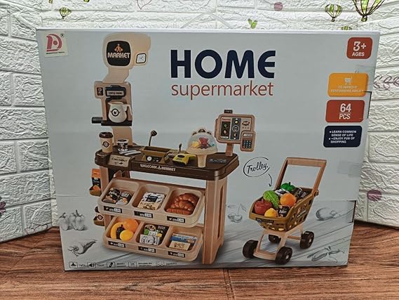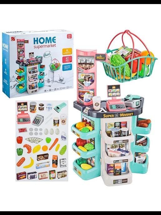 لعبة بتصميم سوبر ماركت مع جهاز تسجيل نقدي مع صوت وضوء وجهاز فيزا 💳 وسكانر، مع سلة تسوق يدوية وخضروات وفواكه وصناديق الطعام والبيض، مكون من 47 قطعة