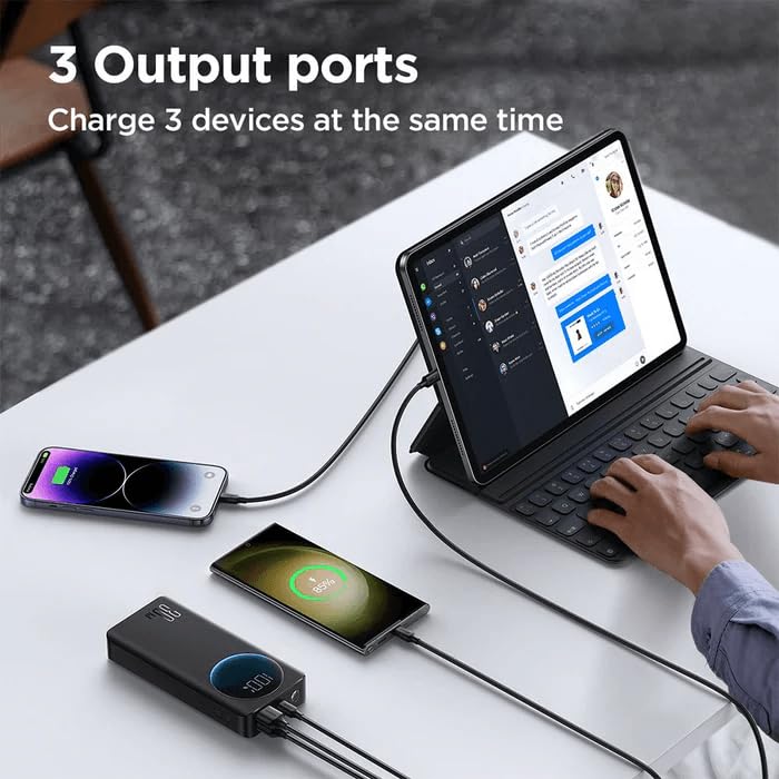 - منافذ ثلاثية (2 USB، 1 بي دي): يتميز بمنفذي USB قياسيين ومنفذ واحد لتوصيل الطاقة (بي دي)، يسمح شاحن الباور بانك هذا بالشحن المتزامن لثلاثة أجهزة. يدعم منفذ بي دي الشحن السريع للأجهزة المتوافقة، مما يضمن توصيل طاقة سريع وفعال.