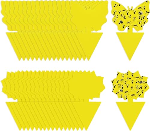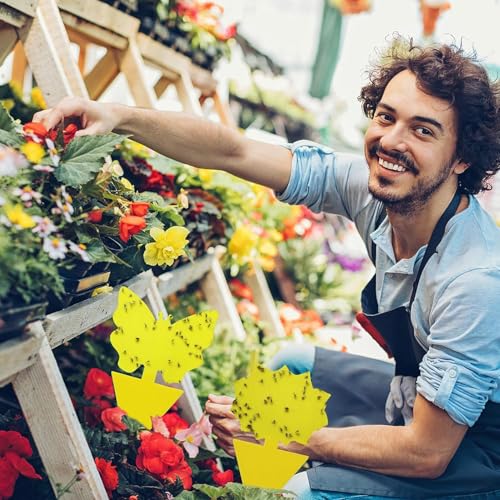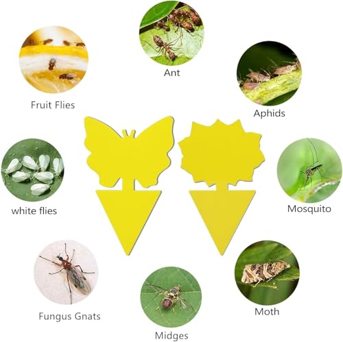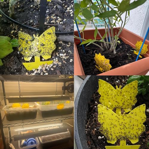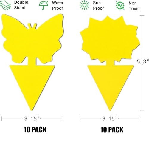 - مصائد لاصقة باللون الأصفر: تصميم المصائد الخاص بشكل الفراشات والزهور مع الصمغ اللاصق على الوجهين يجعلها فعّالة في جذب حشرات النباتات الطائرة بفضل الألوان الزاهية. رائعة للنباتات الخارجية والداخلية وخصوصًا تلك المزروعة في الأصص