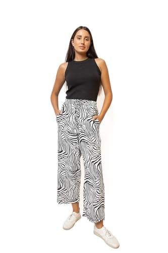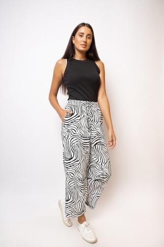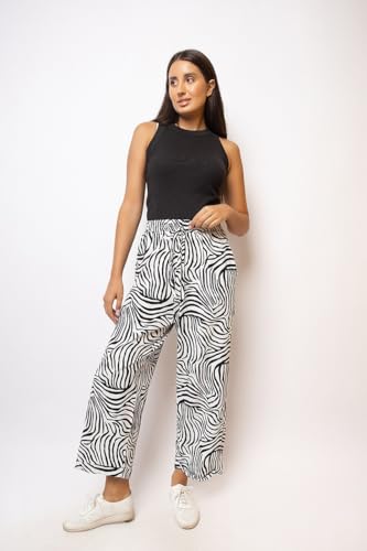 بنطلون مطبوع بأرجل واسعة مع حبل، لون أبيض