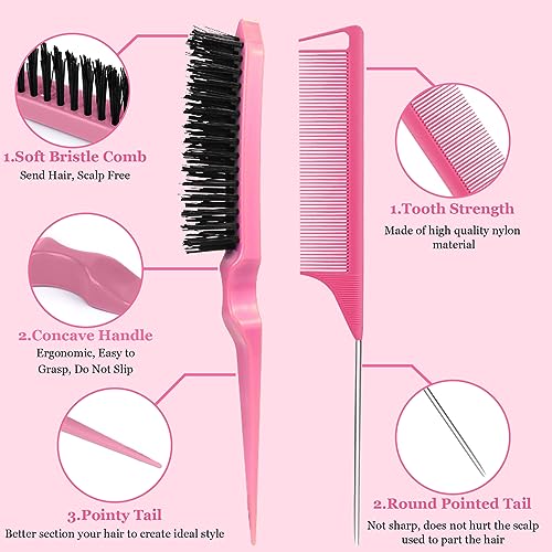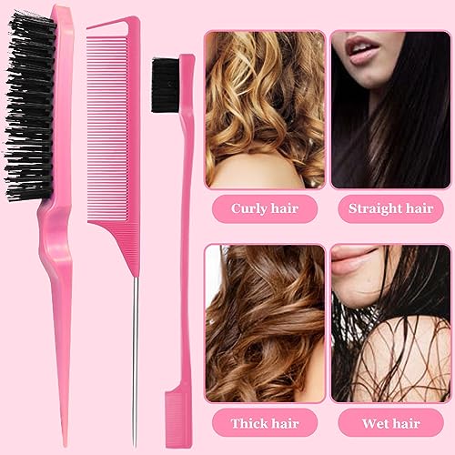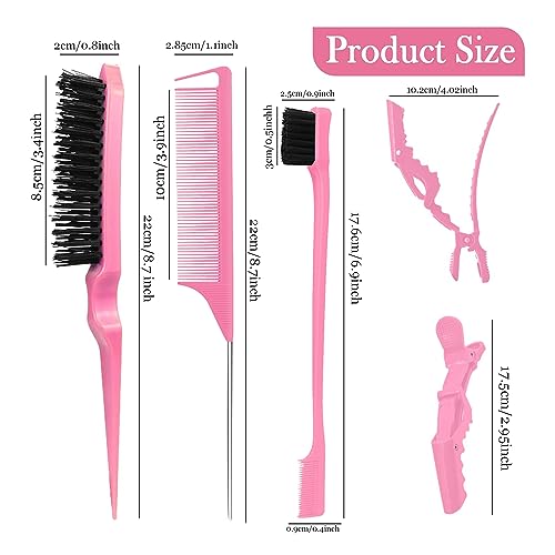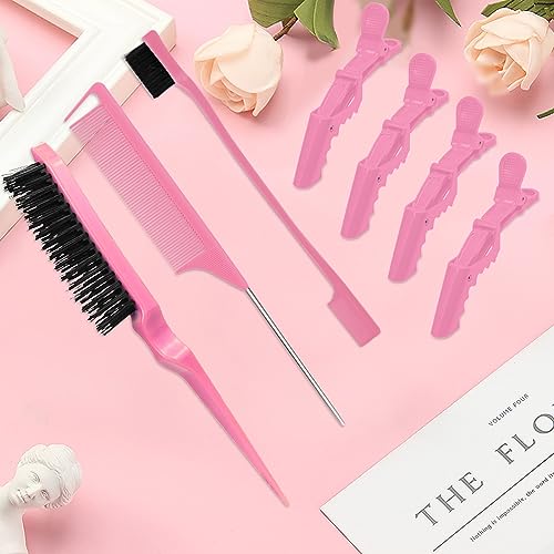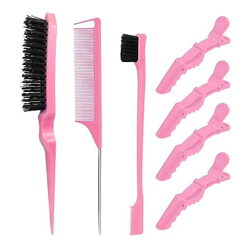 مجموعة فرش تصفيف الشعر مكونة من 7 قطع - فرشاة شعر بشعيرات ناعمة ومشط ذيل الفئران مع مشابك تمساح، فرشاة حافة للشعر الرطب او الجاف للتحكم في الحواف وتنعيم شعر الأطفال، لون وردي