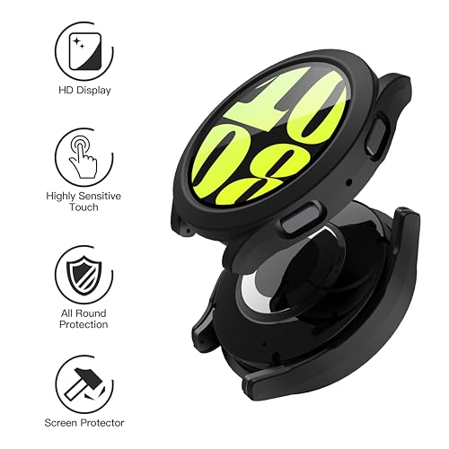 - تصميم دقيق: مصمم خصيصًا لساعة سامسونج جالاكسي 6، يوفر هذا الجراب المزود بواقي شاشة مدمج فتحات دقيقة لجميع تفاصيل الساعة. التصميم المجوف حول الأزرار يسهل التشغيل. يحافظ تصميم الشاشة المسطحة الرفيع للغاية على رؤية شاشتك، مما يعزز الجمالية العامة ويضيف أناقة ساعة سامسونج جالاكسي الخاصة بك.