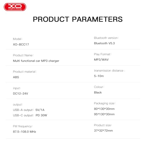 - نطاق التردد: يعمل بين 87.5-108.0 ميجاهرتز. صيغ الموسيقى: يدعم تنسيقات MP3 وWAV.
