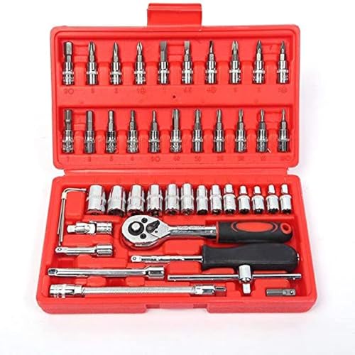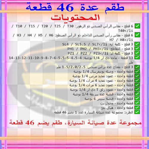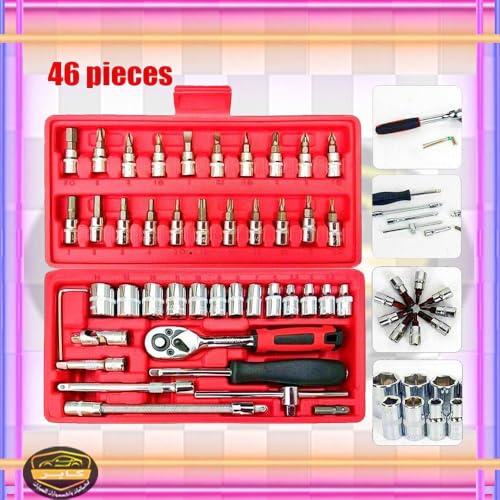 - ✅ مجموعة ادوات اصلاح السيارات المكونة من 46 قطعة ، صندوق أدوات إصلاح السيارات، أداة إصلاح محمولة ومتينة ، بما في ذلك الأكمام ومفتاح ربط السقاطة ورأس الدفعة وما إلى ذلك.