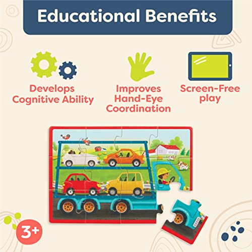 - المحتويات: تأتي هذه المجموعة مع 4 بازل خشبية تتميز بشاحنات ملونة - حامل سيارة ولودر أمامي وحفارة وشاحنة قلابة.
