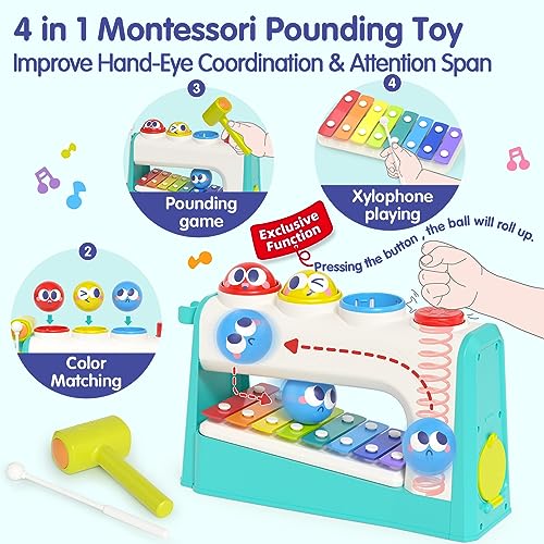 - 【مجموعة ألعاب متعددة الوظائف】- ألعاب المطرقة والكرات هي ألعاب مطرقة رائعة للأطفال الصغار من عمر 1 إلى 3 سنوات حيث يمكنهم الطرق والدوران لملاحظة تأثير السبب والنتيجة. يمكن أن يعزز الاكسيليفون متعدد الوظائف للأطفال الصغار من عمر 1 إلى 3 سنوات نمو تركيز الرضع والتنسيق بين اليد والعين والتلاعب وحركة الذراع والتعرف على الصوت. قم برمي الكرات لأسفل على الاكسيليفون أو اضغط على الزر للحفاظ على الكرة تتدحرج. هذه الألعاب أكثر متعة من مجرد لعبة الطرق التقليدية.