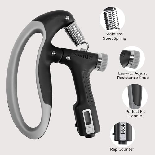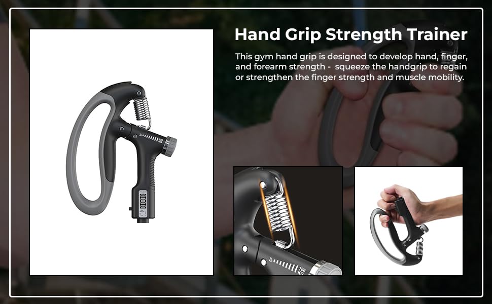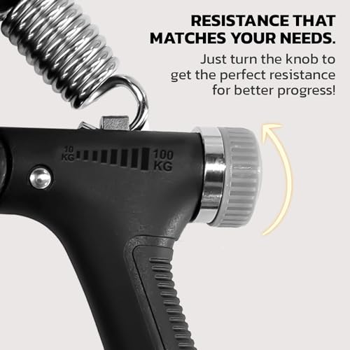 - مقبض يد قابل للتعديل: مثالي لتقوية قبضة الساعد والمعصم والإصبع، إنه مقبض يد قابل للتعديل مع مقاومة قابلة للتعديل من 5 كجم إلى 60 كجم. ما عليك سوى لف المقبض إلى الإعداد المفضل لديك واحصل على أداة تقوية قبضة اليد المثالية. عدّ تمارينك أثناء بناء عضلات الساعد والمعصم والأصابع بمقاومة مثالية في الجيم وفي العمل.