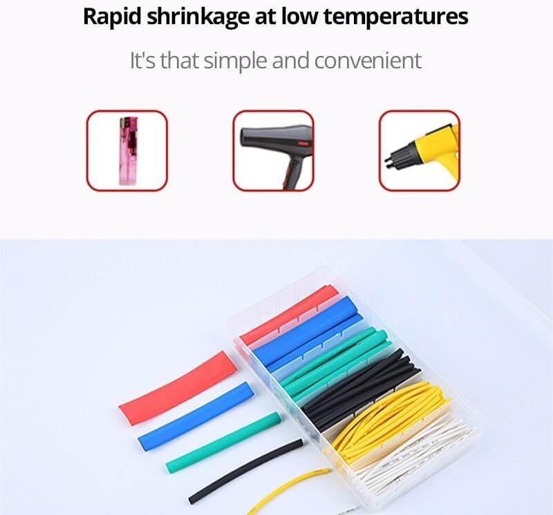 - 2. أنابيب الانكماش الحراري مصنوعة من أنابيب بلاستيكية مرنة تنكمش بإحكام حول الكابل عند تعرضها للحرارة. وهذا يضمن غطاءً آمنًا ومتينًا يحمي الكابلات من العناصر الخارجية ويمنع أي ضرر محتمل. مع مجموعة من 164 قطعة، تأتي هذه الأنابيب بأحجام وألوان مختلفة، مما يمنحك مجموعة متنوعة من الخيارات لتناسب احتياجاتك الخاصة.