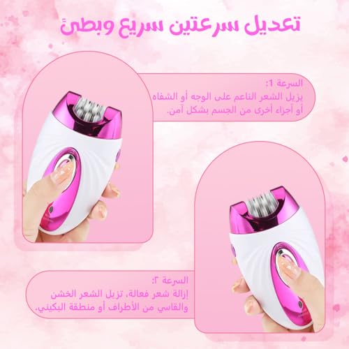 - مستويان للسرعة: اختاري من بين إعدادين للسرعة لإزالة الشعر. استخدمي السرعة المنخفضة للمناطق الحساسة والسرعة الأعلى لإزالة الشعر بشكل أسرع وفعال.