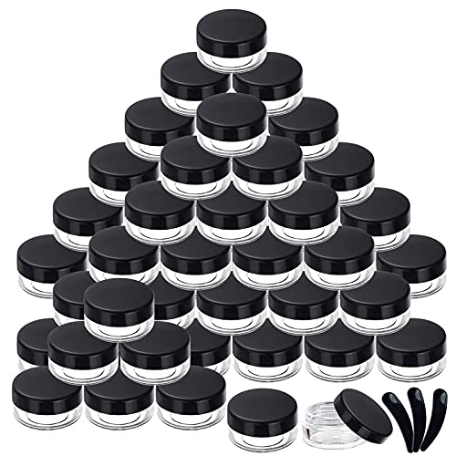 برطمان عينات فارغ لمستحضرات التجميل من البلاستيك سعة 5 جم مع غطاء لولبي بلون أسود للسفر لتخزين الكريم والعينات والأظافر والبودرة وايشادو والمكياج مع 3 معالق سباتولا صغيرة من Yalbdopo، عبوة من 50 قطعة