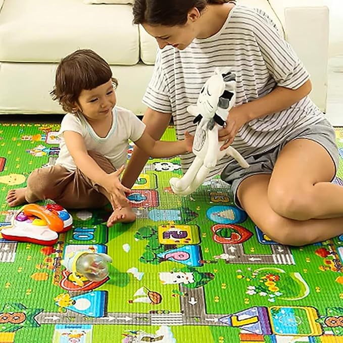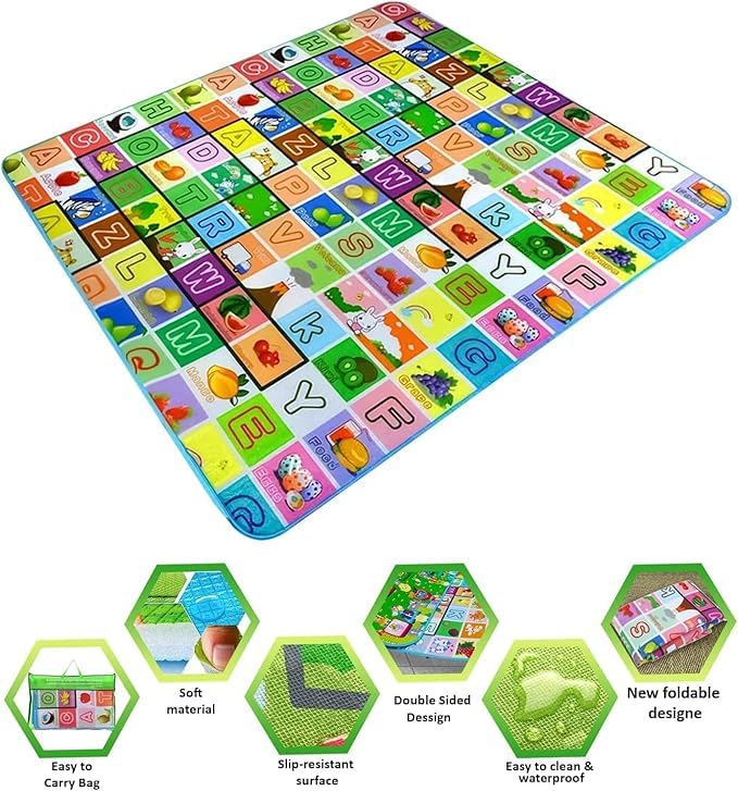 - [وجهان برسومات تعليمية] : تتميز السجادة بتصميم مزدوج يحتوي على رسومات تعليمية ممتعة تُشجّع الطفل على التعلم والتفاعل، وتضفي لمسة مرحة على وقت اللعب.