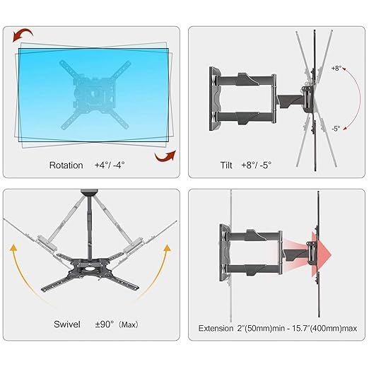 - ⭐حرفية رائعة، هيكل قفل آمن، إمالة مريحة، وتعديل مستوى سهل يجعلها سهلة الاستخدام. يمكنك توسيع التلفزيون الخاص بك 15.7 انش (400 ملم) من الحائط، وطيه على الأقل 2 انش (50 ملم) في الحائط، مما يوفر لك مساحة قيمة لغرفتك.