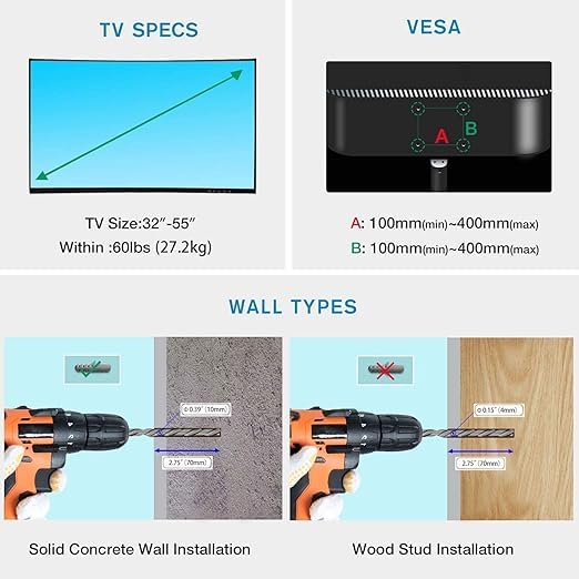 - ⭐حامل تلفزيون عالمي: يناسب معظم أجهزة تلفزيون LED وLCD و4K مقاس 32-55 بوصة حتى 60 باوند (66 كغم) متوافق مع فيسا من 100 × 100 إلى 400 × 400 ملم