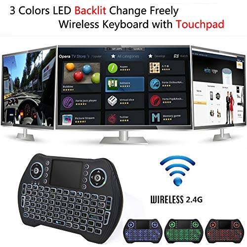 - وظيفة الإضاءة الخلفية LED 3 في 1 متعددة الوظائف - كيبورد لاسلكي + ماوس + لوحة لمس، اتصال لاسلكي RF 2.4 جيجا، استمتع بمسافة تشغيل تصل إلى 10 أمتار ويمكنك ضبط لون الإضاءة الخلفية باللون الأحمر والأزرق والأخضر، أو يمكنك فقط إيقافها.