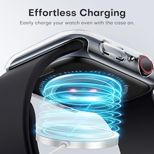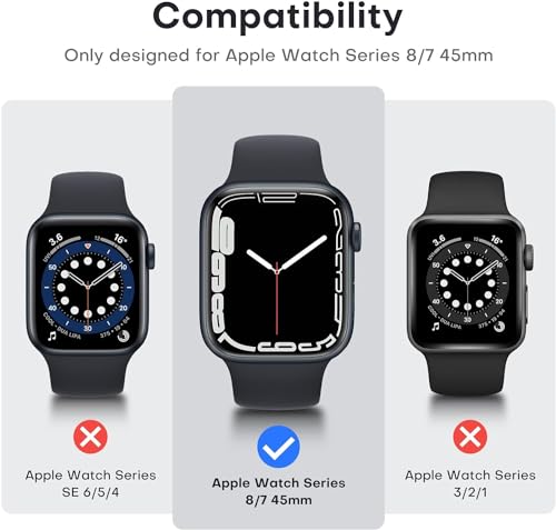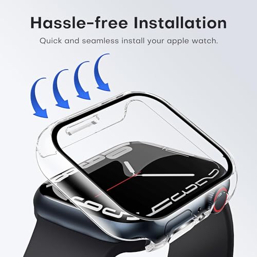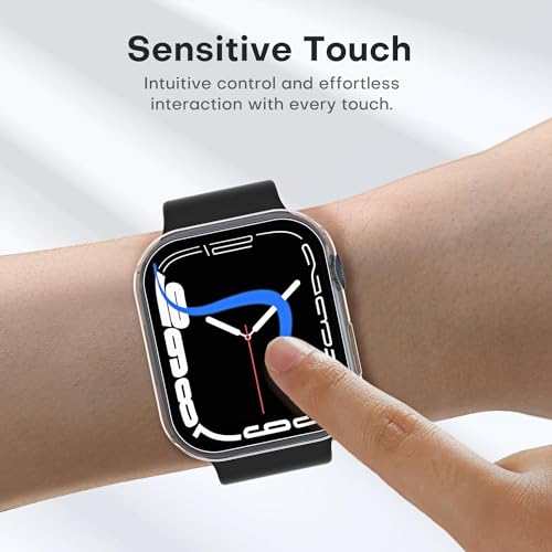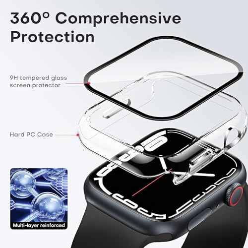 جراب صلب متوافق مع ساعة ابل سلسلة 8/7 45 ملم مع شاشة حماية من الزجاج المقوى رفيعة وممتصة للصدمات وحساسة للمس بتغطية كاملة ووضوح عالي الدقة HD ودرجة صلابة 9 لساعة اي ووتش 45 ملم، قطعتان من المعز، شفاف
