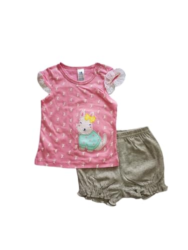 سالوبيت قصير صيفي للبنات من القطن المستورد مكون من 3 قطع، سالوبيت بكباسين من قطعتين بمقاسات منذ الولادة وحتى 36 شهر - للبنات الرضع مجموعة من قطعتين، لون وردي ورمادي، كود 1029، للبنات في عمر 6-9 شهر