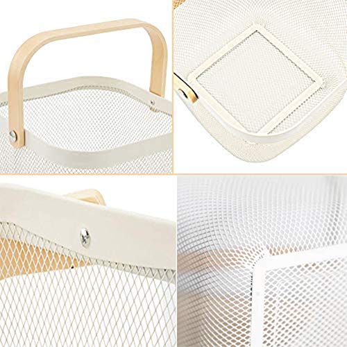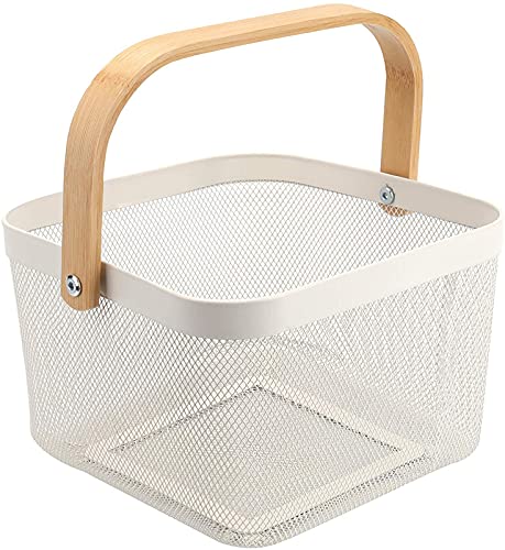 سلة تنظيم وتخزين شبكية معدنية من الستيل متعددة الوظائف مع مقبض مريح من الخيزران بتصميم مثالي للمطبخ والحمام وغرفة المؤن والخزانة والمنزل والتسوق، ابيض