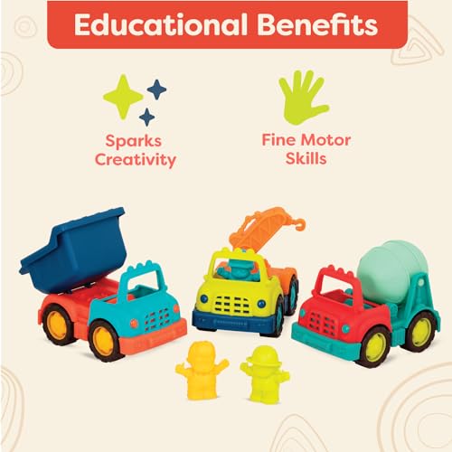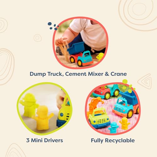 - 3 شاحنات ألعاب: استعد للبناء باستخدام خلاط إسمنت صغير وشاحنة رافعة وشاحنة قلابة! تأتي كل واحدة مع سائق خاص بها.