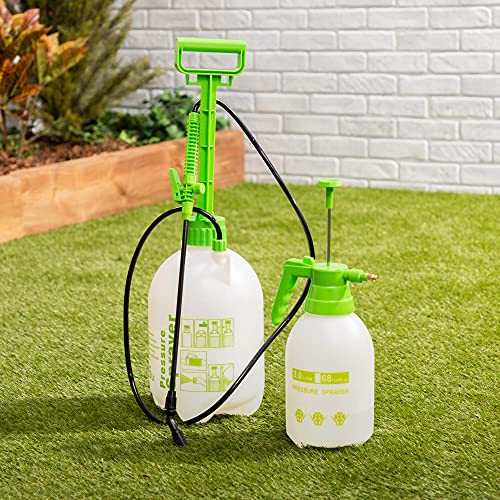 - [مجموعة من 2 بخاخ ضغط] بخاخات ضغط سعة 2 لتر و5 لتر مع صمام أمان وعصا بفوهة نفاثة. مثالية للحدائق، البيوت المحمية، المساحات المزروعة، ولسقي النباتات داخل المنزل.