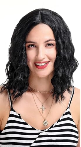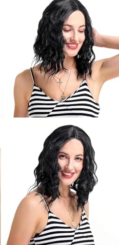 شعر مستعار صناعي قصير بطول الكتف للنساء شعر مستعار مموج بقصة بوب وفرق من المنتصف، للاستخدام اليومي والحفلات لون أسود،