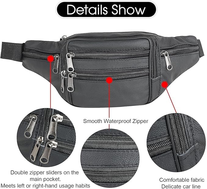 حقيبة فاني باك من الجلد للسفر في الهواء الطلق، حقيبة خصر كبيرة من الجلد البقر 7 جيوب. مناسبة لتسلق الجبال في الهواء الطلق والسفر والتخييم وركوب الدراجات والجري وما إلى ذلك, أسود
