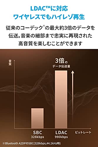 - ترميز صوت عالي الجودة متوافق مع تقنية الصوت اللاسلكية LDAC: يمكن لهذه التقنية نقل كمية معلومات تبلغ ثلاثة أضعاف الترميزات العادية، مما يسمح لك بإعادة إنتاج الموسيقى بجودة تماثل التسجيل الأصلي تمامًا. (مقارنة بتقنية البلوتوث A2DP SBC التي تبلغ 328 كيلوبايت في الثانية عند 44.1 كيلوهرتز).