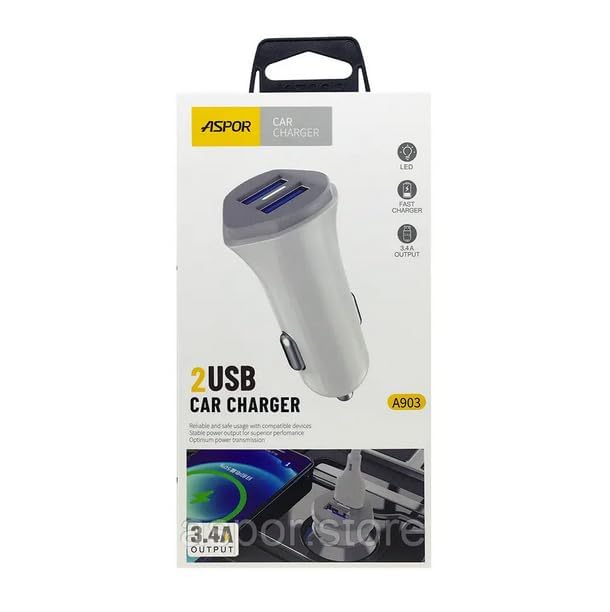 شاحن سيارة A903 بقدرة 3.4 امبير مع منفذين USB مزود بكيبل آيفون، لون أبيض