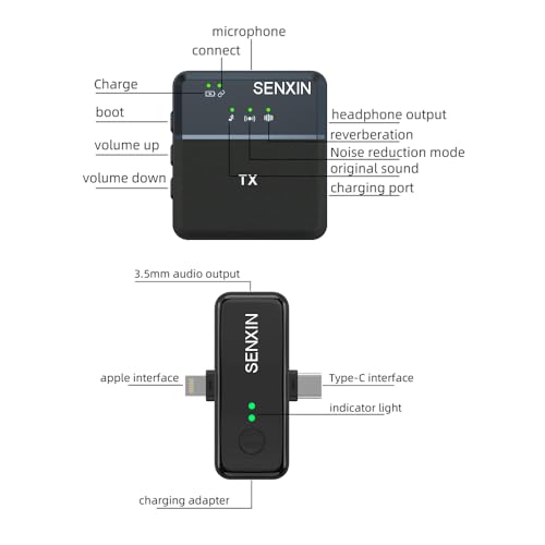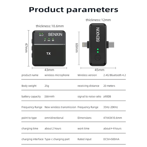 - بطارية مدمجة عالية السعة 300 mAh في الميكروفون، 6-10 ساعات من الاستخدام. باستخدام ميكروفون متعدد الاتجاهات وتقنية نقل 2.4 جيجاهرتز، زمن استجابة منخفض، مضاد قوي للتداخل، يمكن أن يكون نقلًا ثابتًا ومتزامنًا لما يصل إلى 20 مترًا (65 قدم) من المحتوى الصوتي الواضح (بدون عوائق)، في البيئة الخارجية الصاخبة، ولكن أيضًا بزاوية 360 درجة بدون زاوية ميتة وراديو واضح. لا تدع للذهاب من كل تفاصيل الصوت.