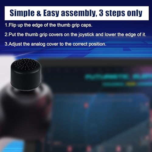 - سهلة الاستخدام: الخطوة الأولى، اقلب حافة مقابض الإبهام للوحة الألعاب. الخطوة الثانية، ضع أغطية الإبهام على عصا التحكم وخفض حافتها. الخطوة الثالثة، اضبط غطاء الزر على الوضع الصحيح..