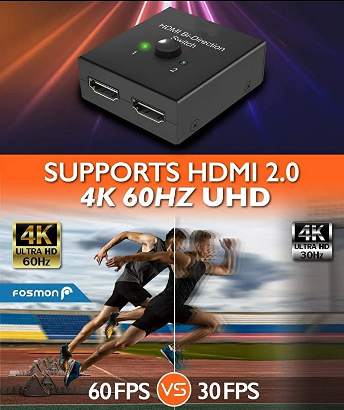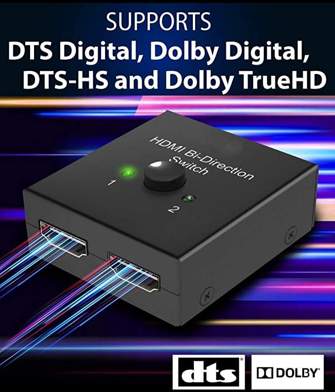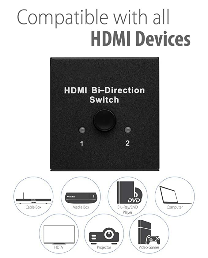 - مفتاح HDMI ثنائي الاتجاه: 3 منافذ، يمكنك توصيل مصدرين HDMI بشاشة HDMI واحدة، أو توصيل مصدر HDMI واحد للتبديل بين شاشتين (سيتم عرض شاشة واحدة فقط في كل مرة).