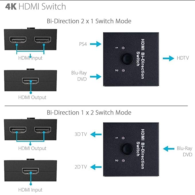 - مفتاح HDMI ثنائي الاتجاه: يمكنك توصيل مصدري HDMI بشاشة HDMI واحدة، أو توصيل مصدر HDMI واحد للتبديل بين شاشتين، يرجى ملاحظة: سيتم تشغيل شاشة تلفزيون واحدة فقط في كل مرة. لا يمكن عرض شاشتين في نفس الوقت.