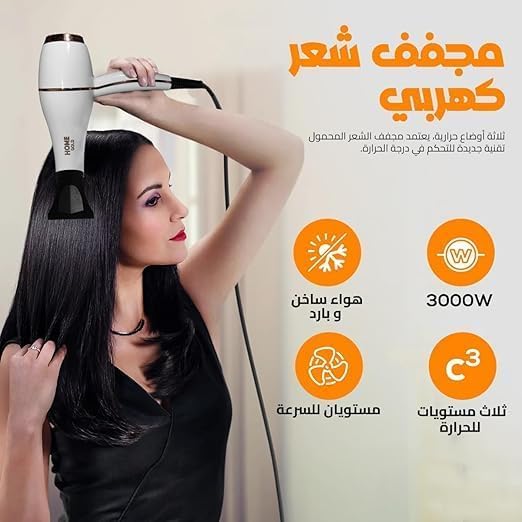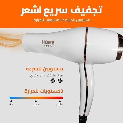 مجفف شعر هوم جولد 3000W - أداء تجفيف فائق بإعدادات متعددة، عناية أيونية وحماية من الحرارة الزائدة (HG-688 (أبيض))