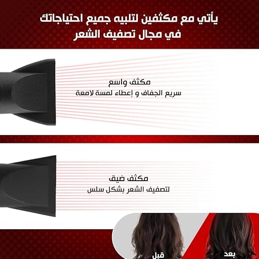 - خيارات التجفيف بالهواء الساخن والبارد: استمتعي بتصفيف متعدد الاستخدامات مع إعدادات الهواء الساخن والبارد، مثالي لتجفيف وتصفيف الشعر وتثبيته.