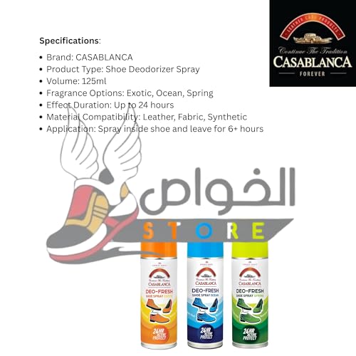 CASABLANCA Shoe Deodorizer Spray – 24Hr Odor Protection – Eliminates Smell from All Shoe Types – Long-Lasting Freshness – 125ml - Sold by: AL KHAWAS Store