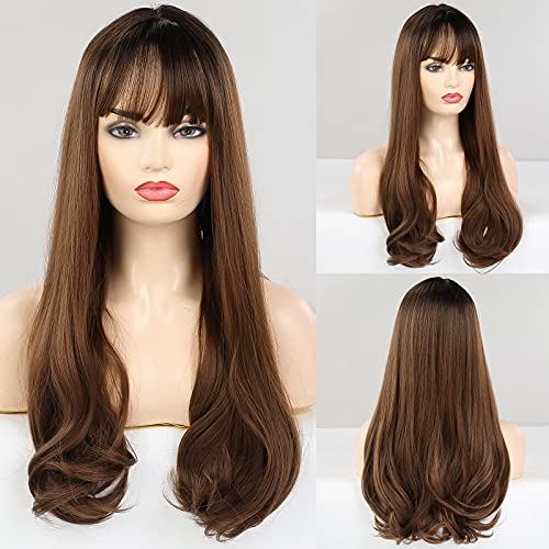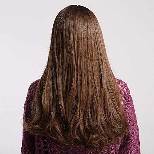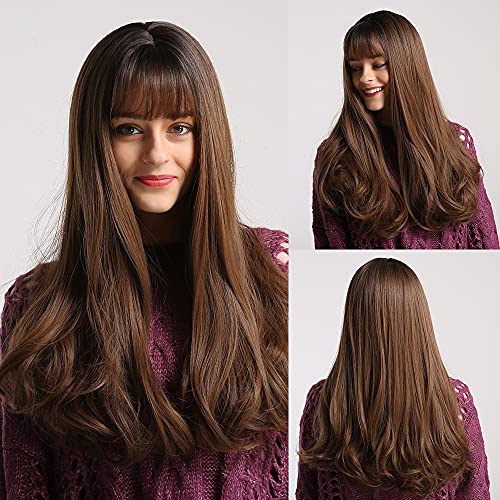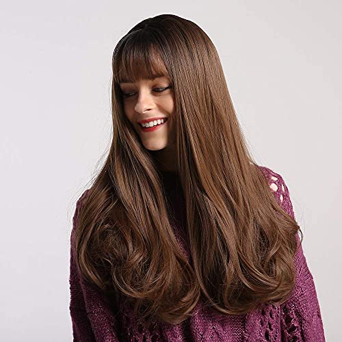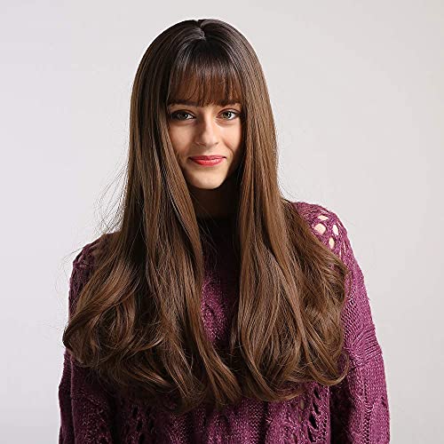 باروكة بلون بني متدرج للنساء من اي سي اي اف، شعر مستعار صناعي طويل مجعد مع غرة، شعر مفرود مع أطراف مجعةد (بني متدرج)