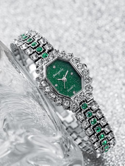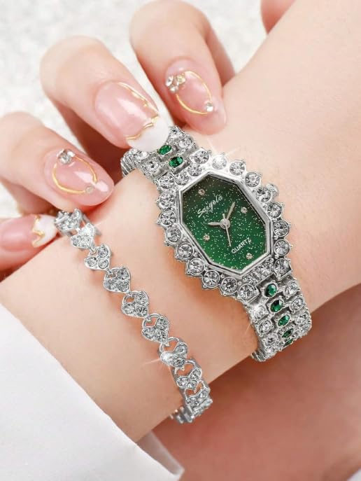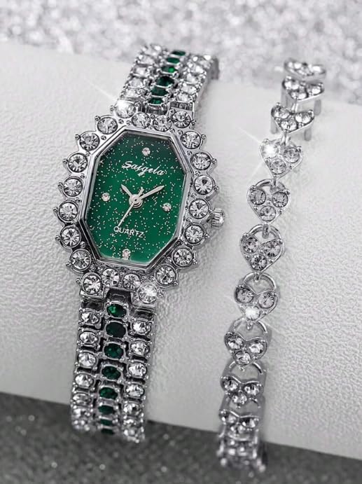 طقم ساعة يد حريمي فاخرة مع سوار قلوب – تصميم مرصع بالكريستال الأخضر والفضي – شكل كلاسيكي أنيق – مناسب للسهرات والمناسبات