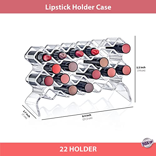 - حامل من 22 فتحة: منظم عالمي مصمم لاستيعاب ما يصل إلى 22 من أحمر الشفاه المفضل لديكِ. مع هذا التصميم الذكي، سيبقى أحمر الشفاه دائمًا في مكانه. صممت الوسادة السفلية لحماية أحمر الشفاه من الخدوش والأضرار الأخرى أثناء التخزين.