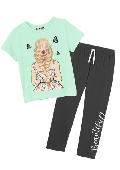 بيجامه بناتي من قطعتيين تيشرت اخضر فاتح به رسمه وبنطلون اسود