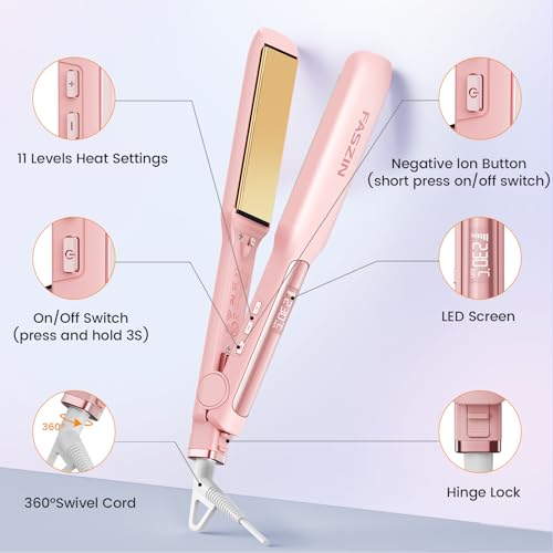 مكواة احترافية لفرد الشعر بلوح عريض 42 ملم من التيتانيوم والأيونات السالبة مع تسخين سريع في 30 ثانية و11 مستوى درجة حرارة قابل للتعديل من 130 إلى 230 درجة مئوية من فاسزين، وردي
