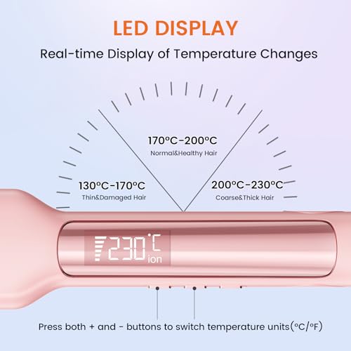 - 【تقنية التسخين السريع 2X】تتميز بتقنية التسخين هيت شوتز وتسخين ام سي اتش حتى 180 درجة مئوية في 30 ثانية فقط. تحتوي على 11 إعدادًا لضبط درجة الحرارة (من 130 درجة مئوية إلى 230 درجة مئوية) لتتناسب مع جميع أنواع الشعر. تتيح لك شاشة العرض ليد رؤية تغيرات درجة الحرارة في الوقت الفعلي.
